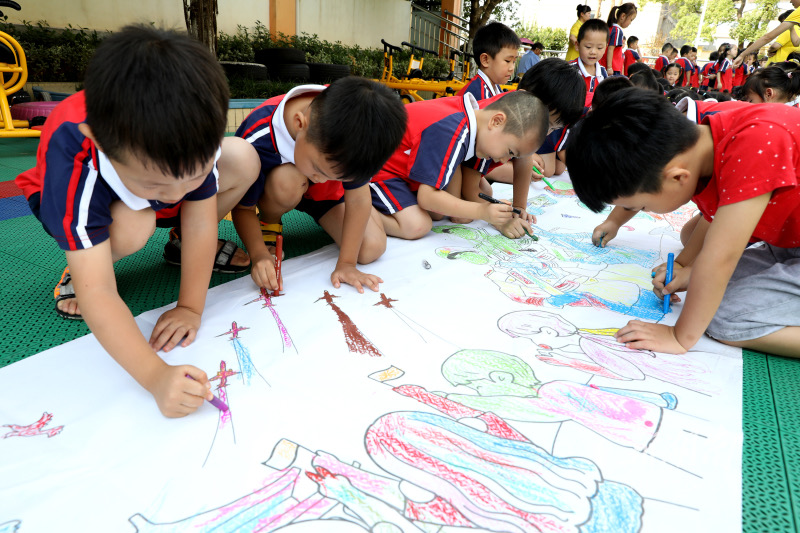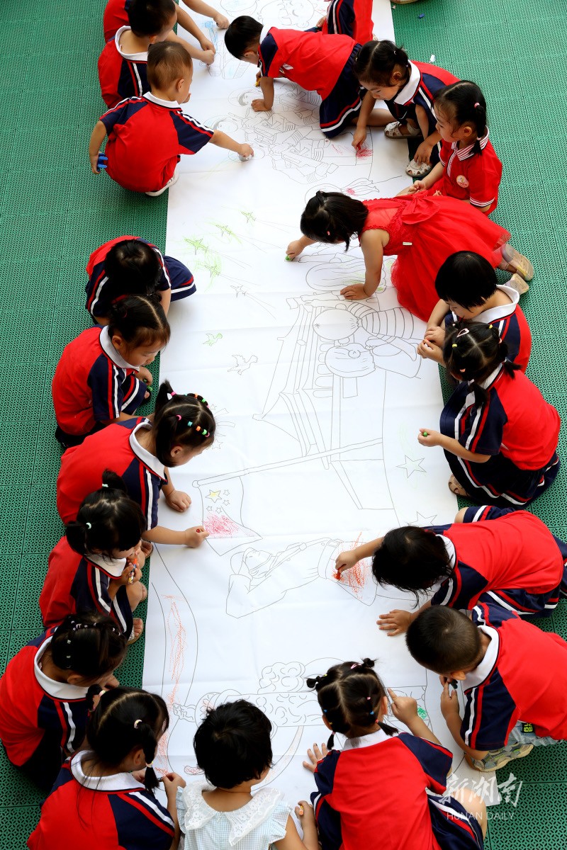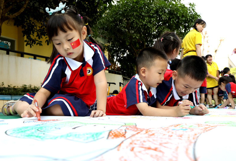 9月30日,衡陽幼兒師范高等??茖W(xué)校附屬幼兒園的小朋友們在長卷上繪畫。當(dāng)天,該幼兒園舉行“我愛祖國”迎國慶活動,小朋友在老師的指導(dǎo)下,在長卷上用畫筆表達(dá)對祖國的熱愛和祝福。劉愛成 攝