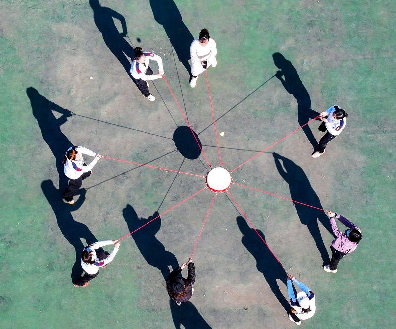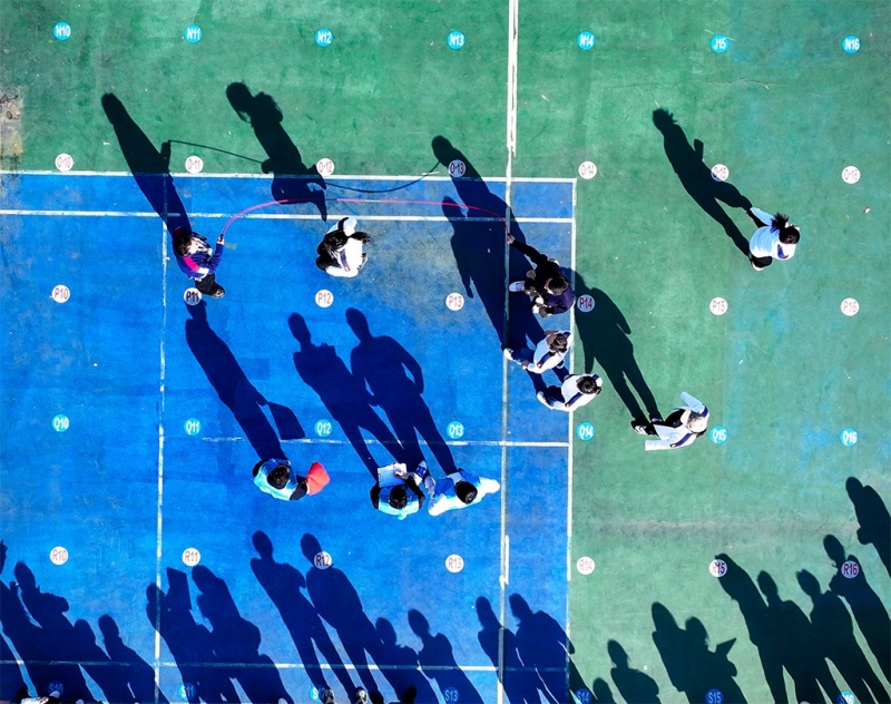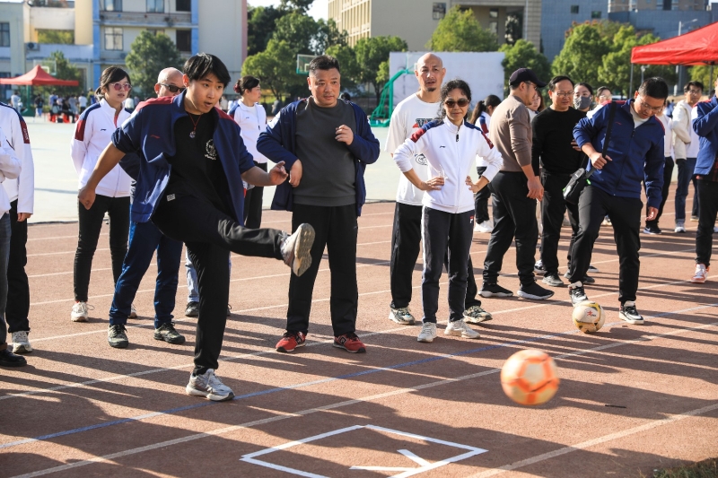 400多名教職工分別參加競速長繩、擊鼓同心、齊心投籃和趣味足球等四個(gè)項(xiàng)目的角逐。在競速長繩項(xiàng)目中,老師們身姿矯健,輕盈躍動(dòng),展現(xiàn)了不凡的協(xié)調(diào)能力和默契配合。每一次成功的跳躍,贏得現(xiàn)場觀眾熱烈鼓掌。擊鼓同心游戲更是考驗(yàn)教職工的團(tuán)隊(duì)協(xié)作能力。各組選手手握鼓繩,通過鼓面全神貫注地?fù)舸蚓W(wǎng)球,節(jié)奏感十足。每一次精準(zhǔn)的敲擊,都凝聚著團(tuán)隊(duì)的智慧,展現(xiàn)了教職工們團(tuán)結(jié)一心、共克時(shí)艱的精神風(fēng)貌。齊心投籃比賽中,老師們分組協(xié)作,投籃動(dòng)作精準(zhǔn)有力?;@球在空中劃出一道道優(yōu)美的弧線,準(zhǔn)確落入籃筐,贏得了陣陣喝彩。趣味足球更是將現(xiàn)場氣氛推向了高潮。老師們腳法嫻熟,努力向高分沖刺。也有左右開工,卻顆粒無收,但大家都盡情享受著趣味足球帶來的快樂與激情。