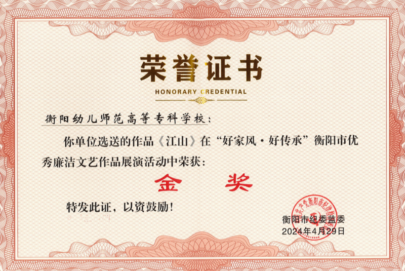 12月30日,我校收到衡陽市紀(jì)委監(jiān)委印發(fā)的《關(guān)于表彰“好家風(fēng)·好傳承”衡陽市優(yōu)秀廉潔文藝品的決定》,學(xué)校選送的大型歌舞節(jié)目《江山》斬獲金獎。