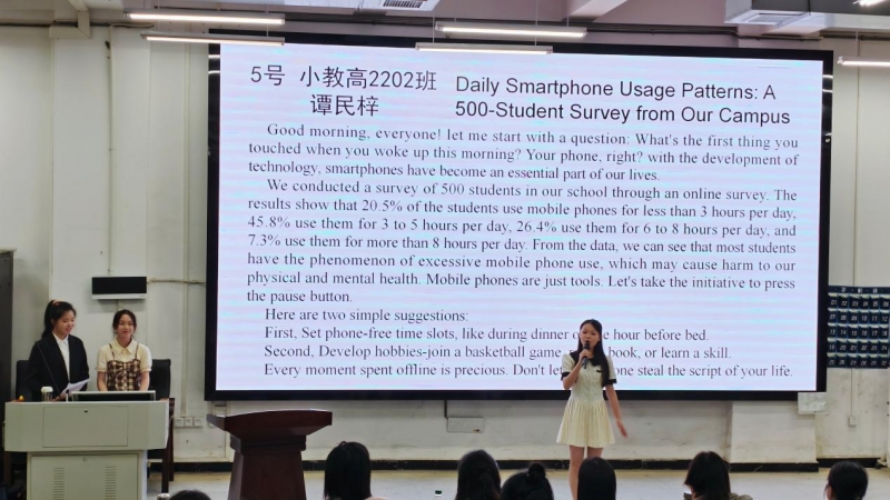 為了與省賽接軌,提升學(xué)生數(shù)據(jù)分析能力與英語應(yīng)用水平,本次賽事以“智慧互聯(lián)時代的青年畫像”為主題,以我校500名大學(xué)生日均手機(jī)使用時長的調(diào)研數(shù)據(jù)為分析對象,經(jīng)過初賽和復(fù)賽選拔出的20位選手依托可視化統(tǒng)計圖表,多維度剖析調(diào)研結(jié)果。賽事采用“2分鐘演講+2分鐘即席問答”模式,從內(nèi)容架構(gòu)、語言質(zhì)量、學(xué)術(shù)規(guī)范、舞臺表現(xiàn)四個維度綜合評定,重點考查數(shù)據(jù)解讀的邏輯嚴(yán)密性與語言表達(dá)規(guī)范性。最終來自小教高2203班的仇媛媛等4名同學(xué)獲得一等獎,小教2407班的寧嘉雯等6人摘得二等獎,另有10名選手獲得三等獎。仇媛媛和學(xué)前2304班的王選艷分別摘得“最具創(chuàng)新提案獎”和“最佳數(shù)據(jù)洞察獎”兩項特別榮譽。(圖文/王芳幼)