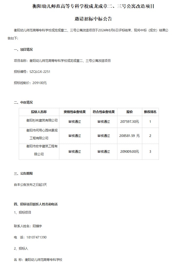 衡陽幼兒師范高等專科學(xué)校成龍成章二、三號(hào)公寓改造項(xiàng)目邀請(qǐng)招標(biāo)中標(biāo)公告