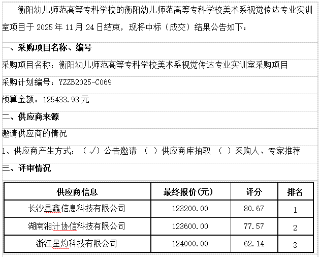 衡陽幼兒師范高等專科學(xué)校美術(shù)系視覺傳達專業(yè)實訓(xùn)室項目成交公告