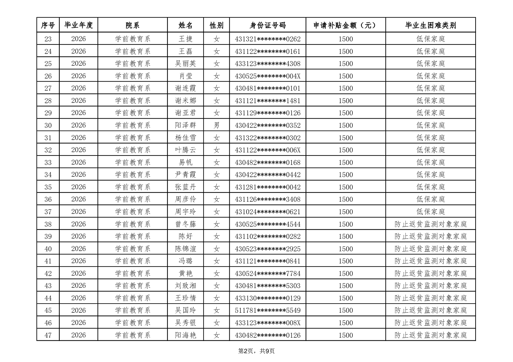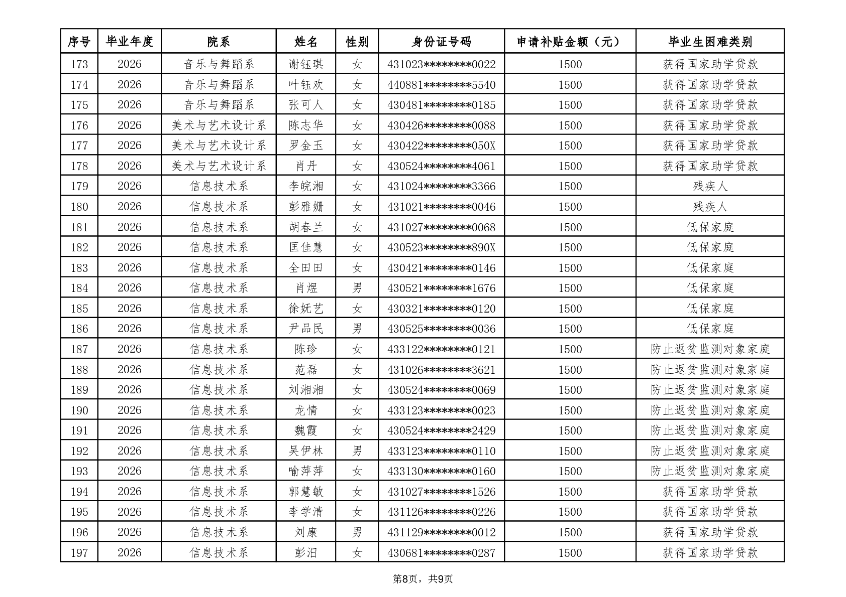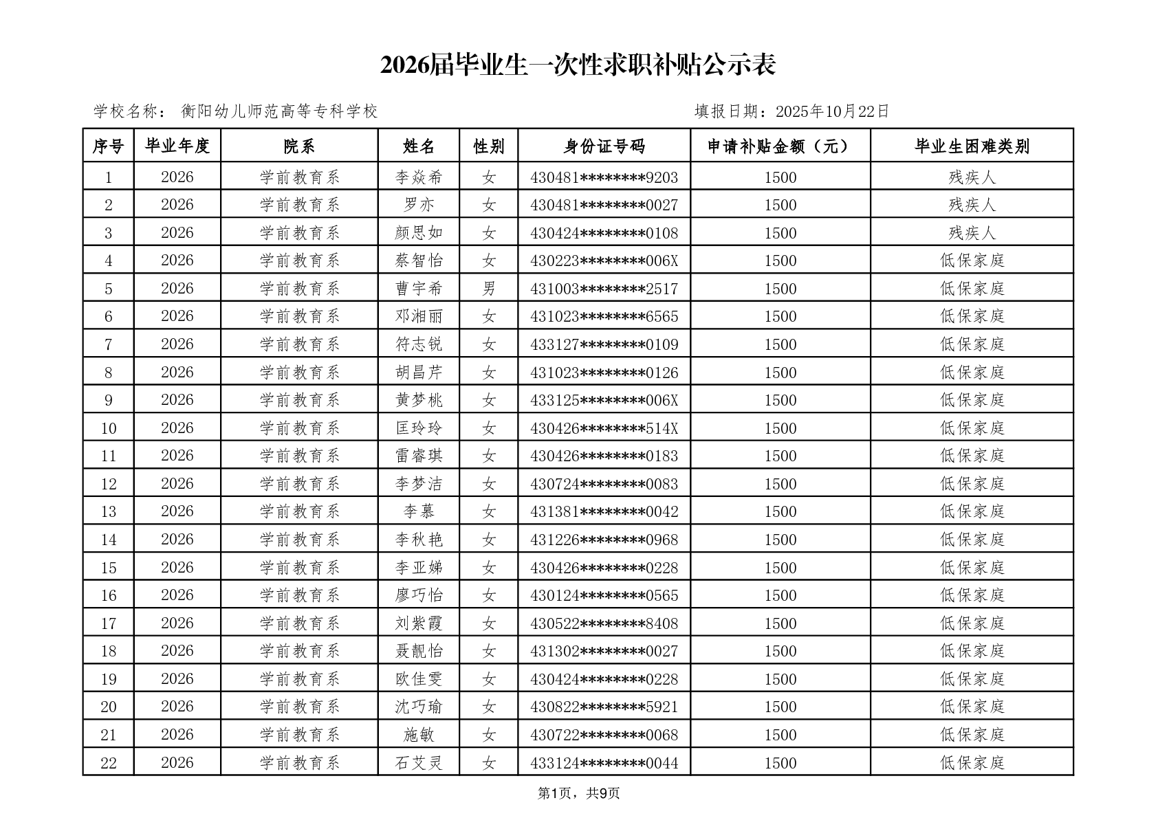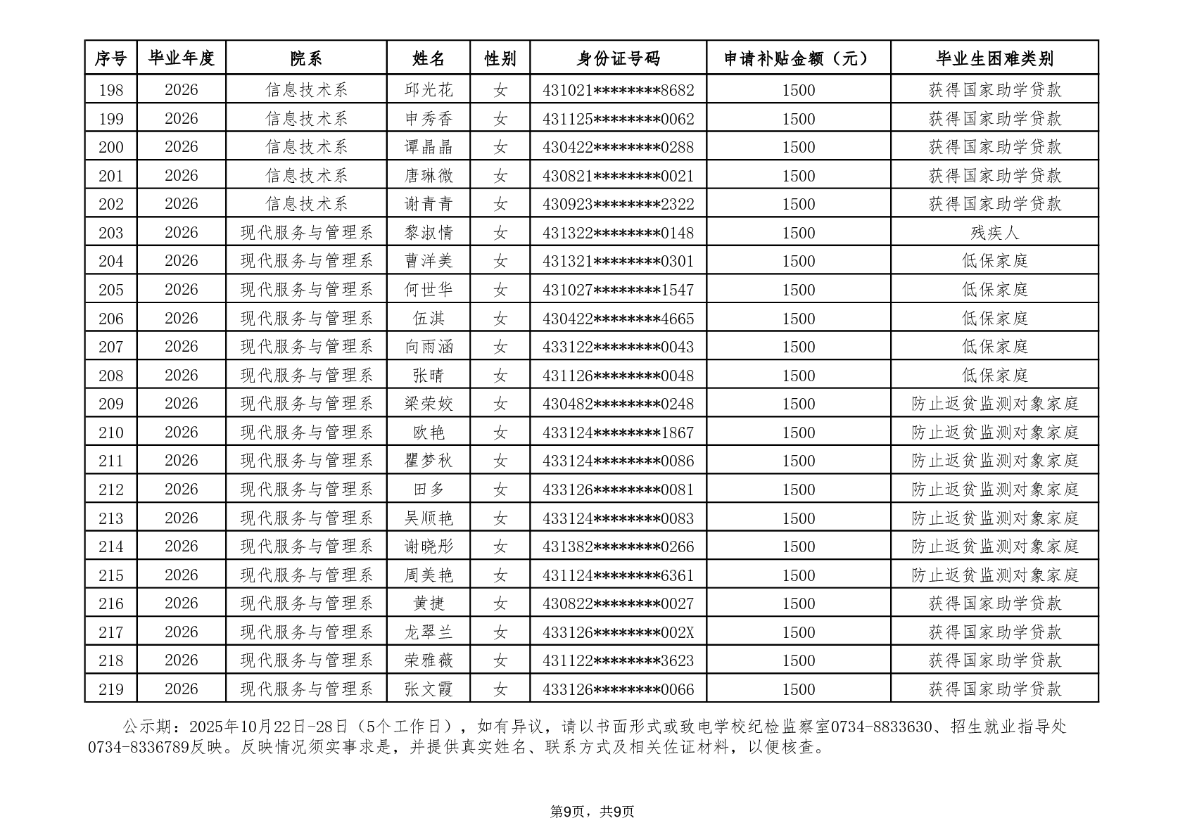 根據湖南省人力資源和社會保障廳等部門《關于做好高校畢業(yè)生一次性求職補貼發(fā)放工作的通知》(湘人社函〔2025〕59 號)文件精神,我校嚴格按照 “個人申請 — 系部初審 — 學校審核 — 人社部門審定” 的流程,對 2026 屆畢業(yè)生一次性求職創(chuàng)業(yè)補貼申請進行了全面審核。現將審核通過的219名畢業(yè)生名單(詳見附件)予以公示。公示期:2025年10月22日-28日(5個工作日),如有異議,請以書面形式或致電學校紀檢監(jiān)察室0734-8833630、招生就業(yè)指導處0734-8336789反映。反映情況須實事求是,并提供真實姓名、聯系方式及相關佐證材料,以便核查。