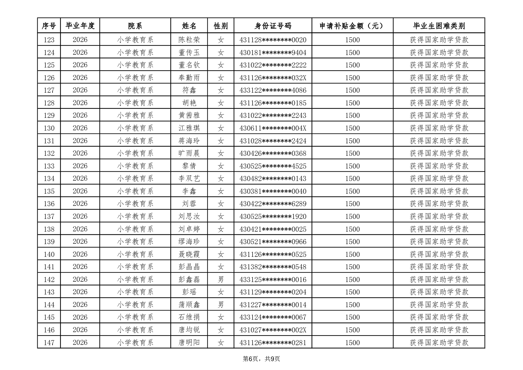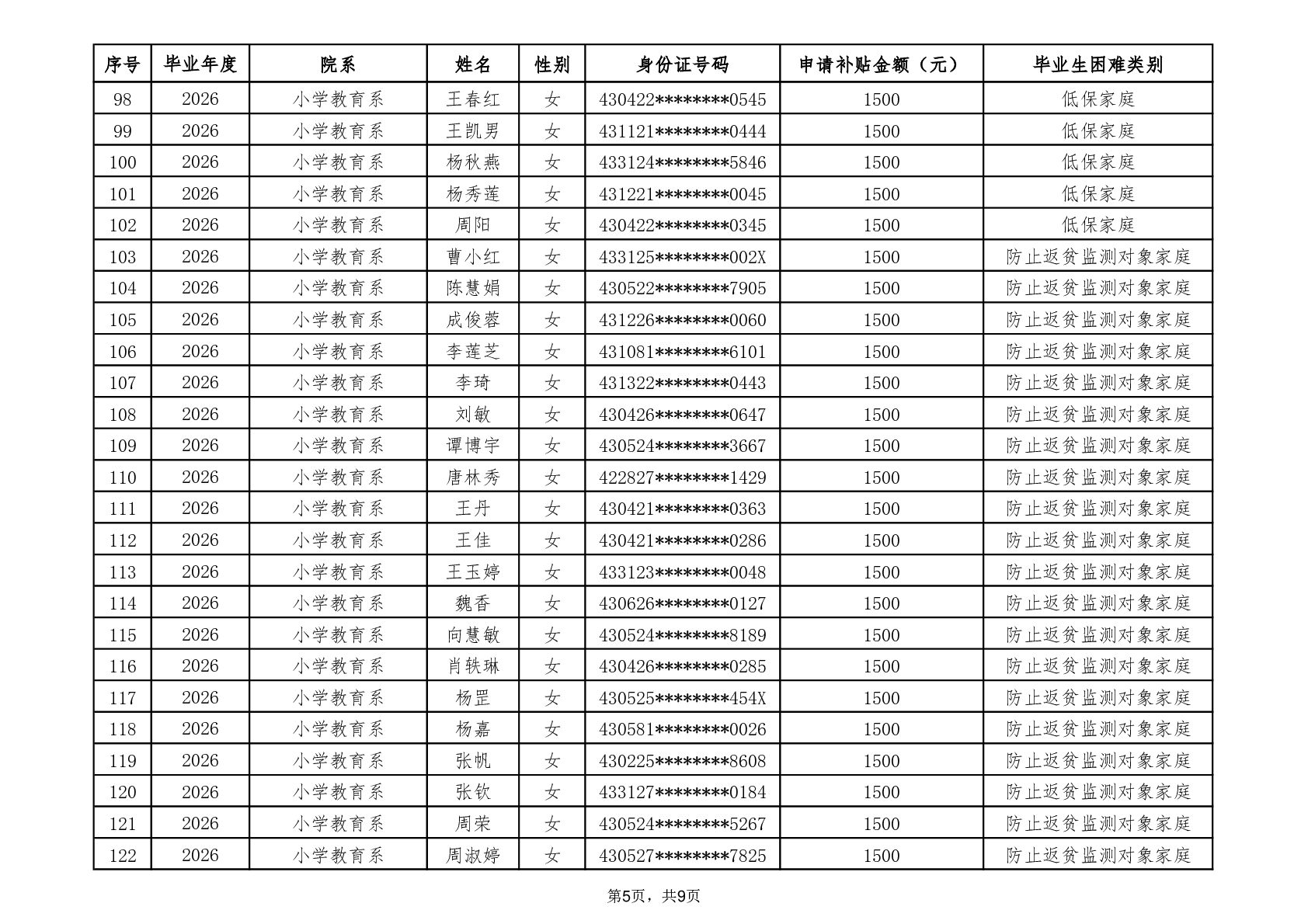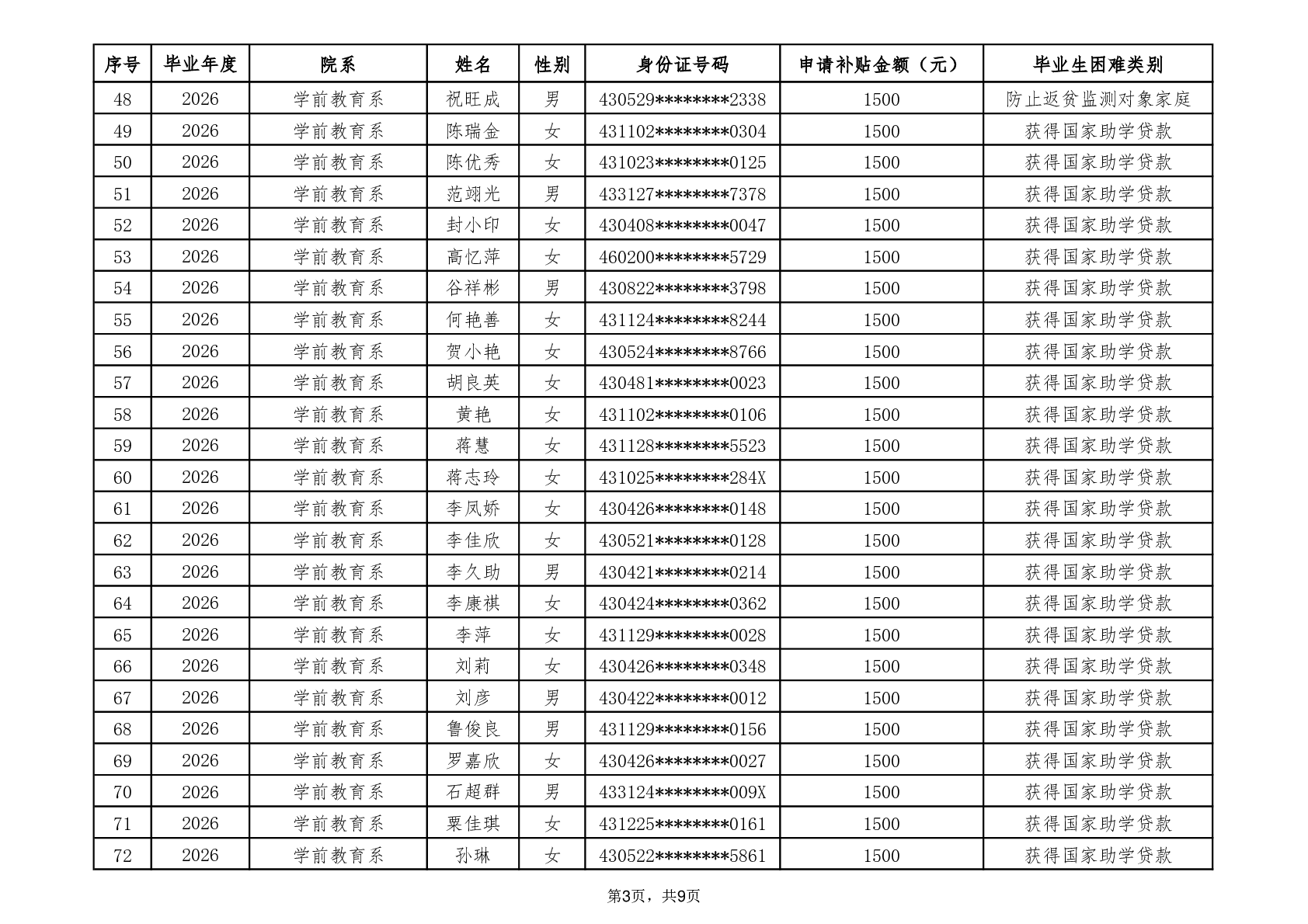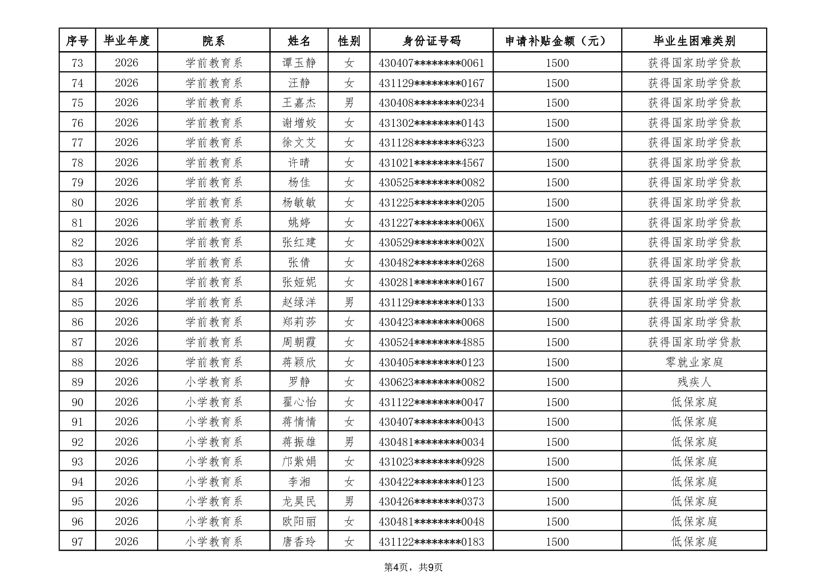 根據湖南省人力資源和社會保障廳等部門《關于做好高校畢業(yè)生一次性求職補貼發(fā)放工作的通知》(湘人社函〔2025〕59 號)文件精神,我校嚴格按照 “個人申請 — 系部初審 — 學校審核 — 人社部門審定” 的流程,對 2026 屆畢業(yè)生一次性求職創(chuàng)業(yè)補貼申請進行了全面審核。現將審核通過的219名畢業(yè)生名單(詳見附件)予以公示。公示期:2025年10月22日-28日(5個工作日),如有異議,請以書面形式或致電學校紀檢監(jiān)察室0734-8833630、招生就業(yè)指導處0734-8336789反映。反映情況須實事求是,并提供真實姓名、聯系方式及相關佐證材料,以便核查。