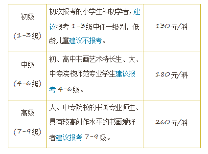 本次開考科目為:毛筆書法、硬筆書法、素描、色彩、動漫畫,國畫(人物、山水、花鳥),各科目均開考1-9級。