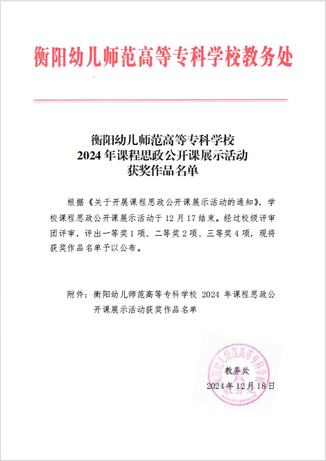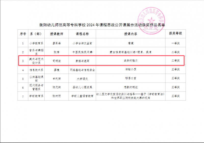 ? ? ? ?在衡陽(yáng)幼兒師范高等專科學(xué)校2024年課程思政公開課展示活動(dòng)中,美術(shù)與藝術(shù)設(shè)計(jì)系司桐溦老師獲得二等獎(jiǎng)。
