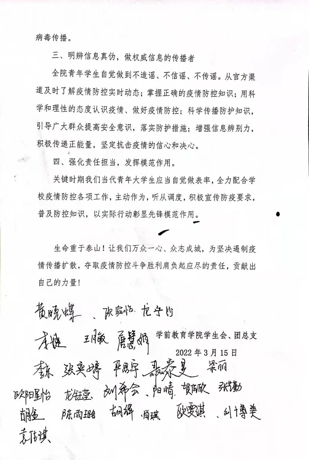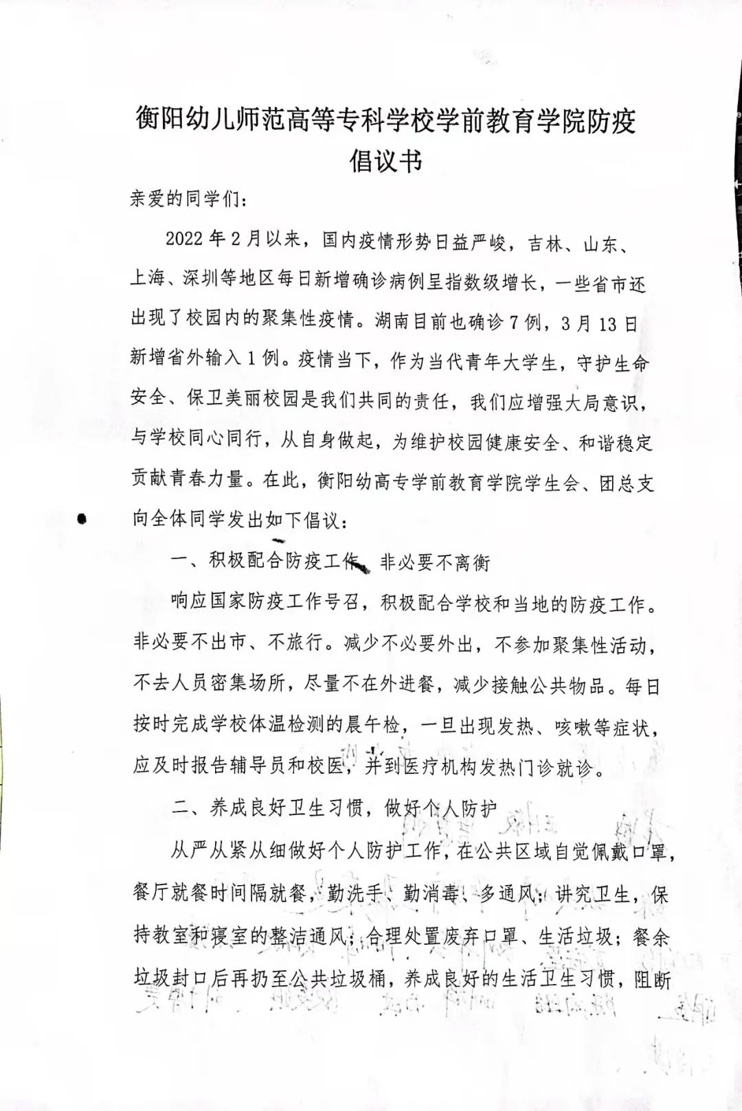 2022年2月以來,國內疫情形勢日益嚴峻,吉林、山東、上海、深圳等地區(qū)每日新增確診病例呈指數級增長,一些省市還出現了校園內的聚集性疫情。湖南目前也確診7例,3月13日新增省外輸入1例。疫情當下,作為當代青年大學生,守護生命安全、保衛(wèi)美麗校園是我們共同的責任,我們應增強大局意識,與學校同心同行,從自身做起,為維護校園健康安全、和諧穩(wěn)定貢獻青春力量。在此,衡陽幼高專學前教育學院學生會、團總支向全體同學發(fā)出如下倡議: 一、積極配合防疫工作,非必要不離衡 響應國家防疫工作號召,積極配合學校和當地的防疫工作。非必要不出市、不旅行。減少不必要外出,不參加聚集性活動,不去人員密集場所,盡量不在外進餐,減少接觸公共物品。每日按時完成學校體溫檢測的晨午檢,一旦出現發(fā)熱、咳嗽等癥狀,應及時報告輔導員和校醫(yī),并到醫(yī)療機構發(fā)熱門診就診。 二、養(yǎng)成良好衛(wèi)生習慣,做好個人防護 從嚴從緊從細做好個人防護工作,在公共區(qū)域自覺佩戴口罩,餐廳就餐時間隔就餐,勤洗手、勤消毒、多通風;講究衛(wèi)生,保持教室和寢室的整潔通風;合理處置廢棄口罩、生活垃圾;餐余垃圾封口后再扔至公共垃圾桶,養(yǎng)成良好的生活衛(wèi)生習慣,阻斷病毒傳播。 三、明辨信息真?zhèn)?,做權威信息的傳播?/p> 全院青年學生自覺做到不造謠、不信謠、不傳謠。從官方渠道及時了解疫情防控實時動態(tài);掌握正確的疫情防控知識;用科學和理性的態(tài)度認識疫情、做好疫情防控;科學傳播防護知識,引導廣大群眾提高安全意識,落實防護措施;增強信息辨別力,積極傳遞正能量,堅定抗擊疫情的信心和決心。 四、強化責任擔當,發(fā)揮模范作用。 關鍵時期我們當代青年大學生應當自覺做表率,全力配合學校疫情防控各項工作,主動作為,聽從調度,積極宣傳防疫要求,普及防控知識,以實際行動彰顯先鋒模范作用。 生命重于泰山!讓我們萬眾一心、眾志成城,為堅決遏制疫情傳播擴散,奪取疫情防控斗爭勝利肩負起應盡的責任,貢獻出自己的力量! 編輯?| 劉姣 文稿 |?學生會 團總支 圖片|團總支宣傳部 責任編輯?| 陳琴 嚴思宇 一審 | 吳迪 終審 | 劉東航