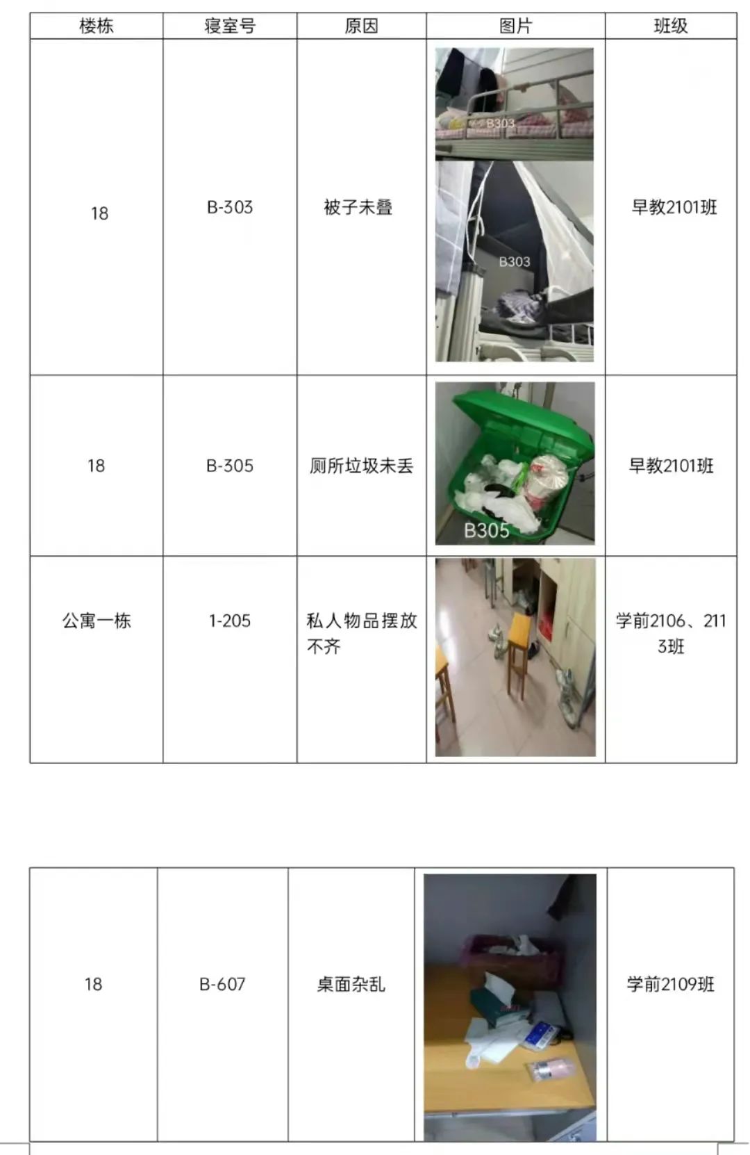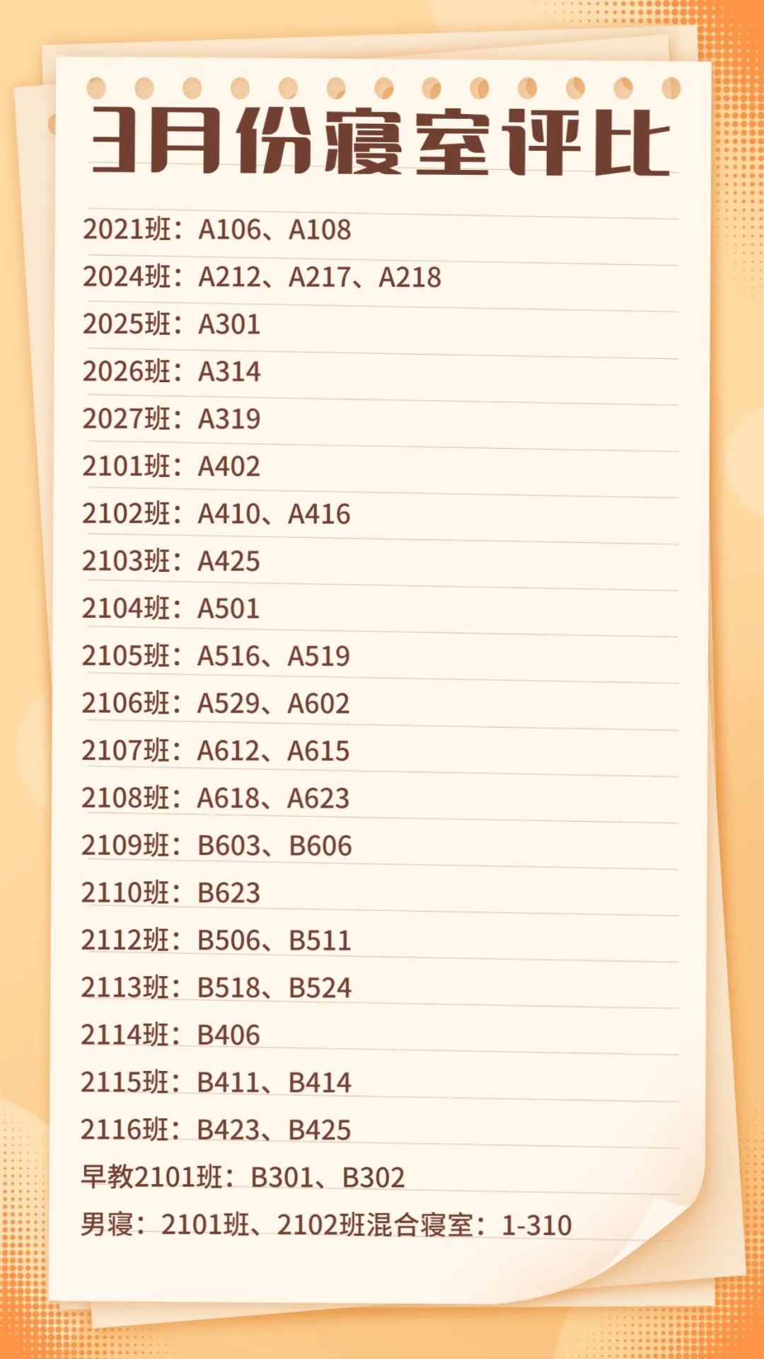 寢室作為一個最小的獨(dú)立集體單位,是寢室成員的喜好與個性展示的舞臺。 為了給同學(xué)們搭建一個展示自我個性,風(fēng)采的舞臺,增強(qiáng)同學(xué)們的團(tuán)結(jié)協(xié)作精神,使同學(xué)們養(yǎng)成良好的生活、衛(wèi)生習(xí)慣,培養(yǎng)同學(xué)們創(chuàng)造美、保持美的能力和習(xí)慣。我院學(xué)生會開展了第三次學(xué)前教育學(xué)院優(yōu)秀文明寢室評比活動。經(jīng)過3月28號老師和同學(xué)的評選,3月份優(yōu)秀文明寢室評比活動現(xiàn)已結(jié)束。現(xiàn)將獲獎寢室公布如下: 恭喜以上獲獎的36個寢室 希望獲獎寢室繼續(xù)發(fā)揚(yáng) 也希望其他寢室向以上寢室學(xué)習(xí) 不斷吸取優(yōu)點(diǎn)、改進(jìn)不足 不斷營造良好的學(xué)習(xí)和生活環(huán)境 為寢室文化建設(shè)事業(yè)錦上添花 接下來我們一起來瞧瞧文明寢室的風(fēng)采吧 2116班B423 2114班B406 2116班B425 2027班A319 2101、2102混寢1-310 2102班A410 2105班A516 2021班A106 三月,萬象更新,春暖花開,姹紫嫣紅。可是在倒春寒的搗亂下,同學(xué)們的衣服更換一日四季,導(dǎo)致本來就不大的宿舍更加擁擠,混亂不堪。疫情強(qiáng)勢來襲,保持宿舍衛(wèi)生干凈整潔,室內(nèi)空氣流通,減少細(xì)菌滋生迫在眉睫。為了同學(xué)們的身心健康,督促同學(xué)們養(yǎng)成良好的個人衛(wèi)生習(xí)慣,學(xué)前教育學(xué)院宿管部對所有寢室進(jìn)行檢查,發(fā)現(xiàn)有一些宿舍還需要整改。希望同學(xué)們共同維護(hù)、保護(hù)、愛護(hù)自己溫馨的“家”。 需要整改的寢室 此次活動,既培養(yǎng)了同學(xué)們定期清潔寢室衛(wèi)生的意識,又增強(qiáng)了寢室的凝聚力,營造出溫馨潔凈的寢室氛圍,同時全力配合做好學(xué)校的防疫工作,宿管部會不懈地堅(jiān)持和奮斗,爭取在未來把工作做得更好,為學(xué)生們的健康、安全保駕護(hù)航。