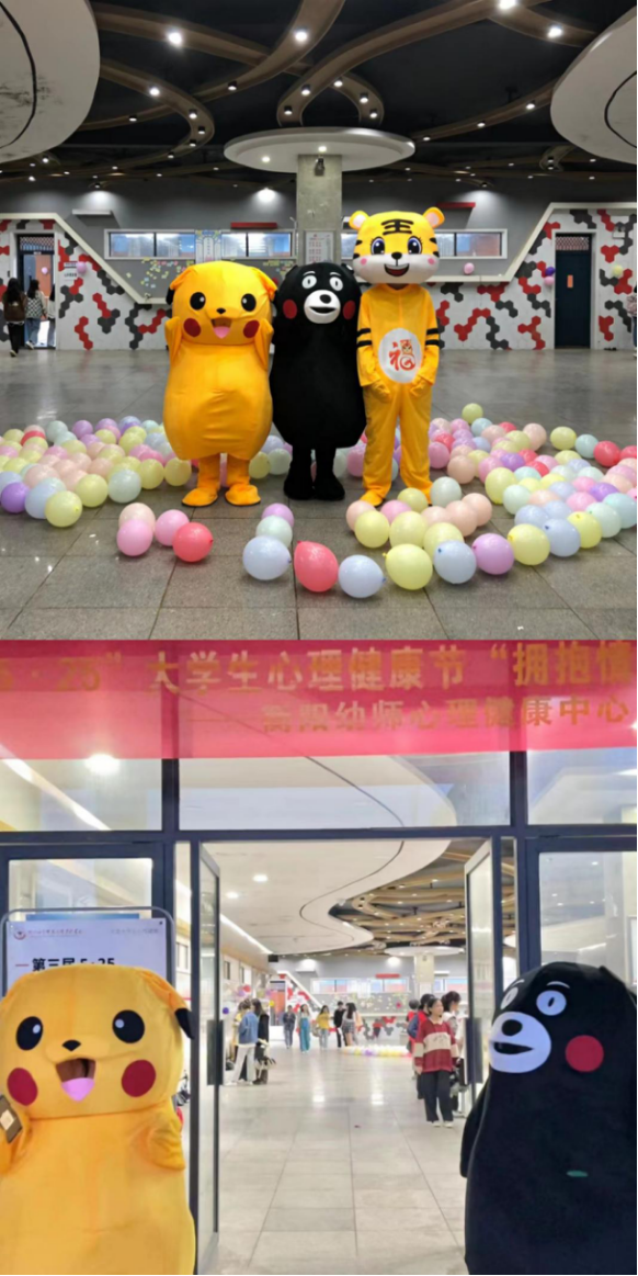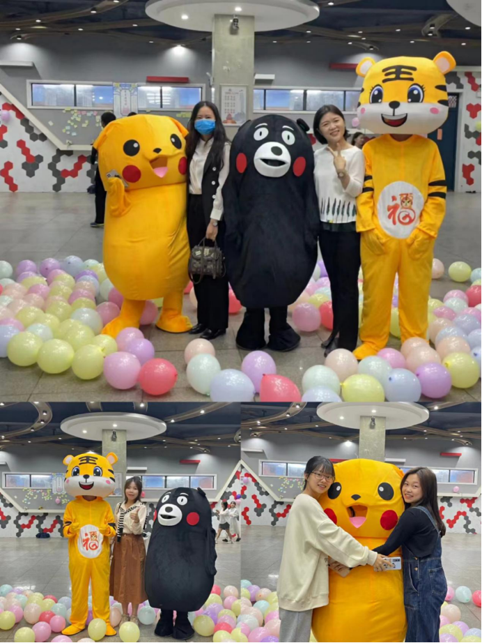 來到我們的游戲區(qū),進(jìn)門就可以看見我們可愛的皮卡丘和熊本熊在等待著給大家愛的抱抱。老師們也迫不及待地跟玩偶擁抱、合影。