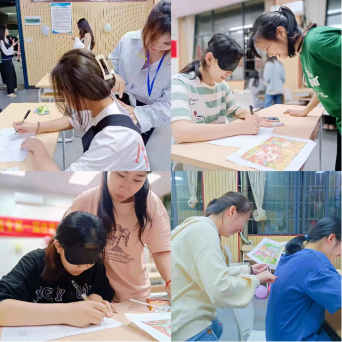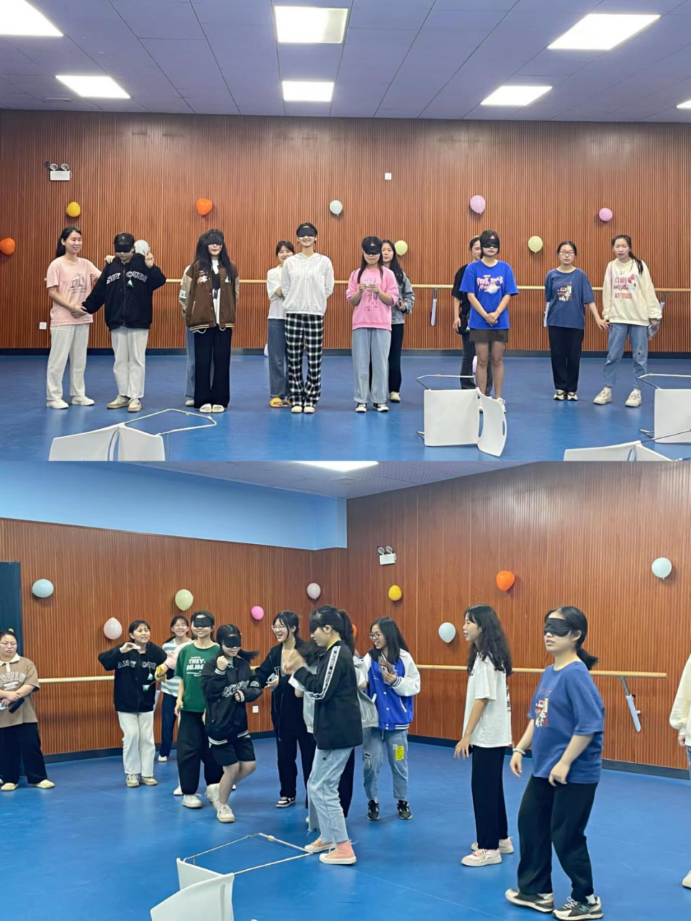 “南轅北轍”活動主要是通過伙伴的溝通引導(dǎo),戴上眼罩避開障礙物,開心的到達(dá)終點(diǎn)。