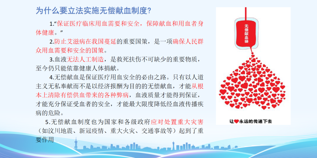 無(wú)償獻(xiàn)血是終身的榮譽(yù),獻(xiàn)血者也會(huì)受到社會(huì)的尊重和愛(ài)戴,是一份造福社會(huì)的公益事業(yè)。捐獻(xiàn)一份血液,奉獻(xiàn)一份愛(ài)心,讓我們用青春的熱血,筑起生命的長(zhǎng)橋!