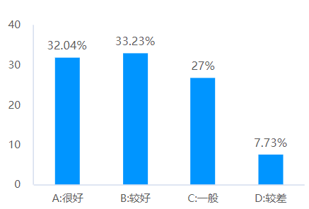 根據(jù)調(diào)查結(jié)果顯示,我系六成學(xué)生認(rèn)為宿舍學(xué)習(xí)氛圍還不錯(cuò),其中32.04%的學(xué)生感覺(jué)非常好。室友通常是與自己接觸時(shí)間最多的同學(xué),而宿舍氛圍也是影響校園學(xué)習(xí)氛圍的重要因素之一,現(xiàn)仍有8%的學(xué)生認(rèn)為宿舍學(xué)習(xí)氛圍不夠濃郁,為此我系將繼續(xù)加強(qiáng)宿舍的管理工作,增強(qiáng)學(xué)生在學(xué)習(xí)態(tài)度的轉(zhuǎn)變,從而增強(qiáng)宿舍的學(xué)習(xí)氛圍。