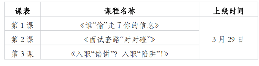 為深入學(xué)習(xí)貫徹習(xí)近平總書記關(guān)于教育和就業(yè)工作的重要指示批示精神,進一步提高大專學(xué)校師生、家長的求職就業(yè)安全意識,教育引導(dǎo)畢業(yè)生防范求職就業(yè)“陷阱”,助推高校畢業(yè)生順利就業(yè)、安全就業(yè),湖南省教育廳聯(lián)合芒果TV精心制作了《求職避“坑”指南——學(xué)生安全就業(yè)指導(dǎo)課》,將于3月29日正式上線。