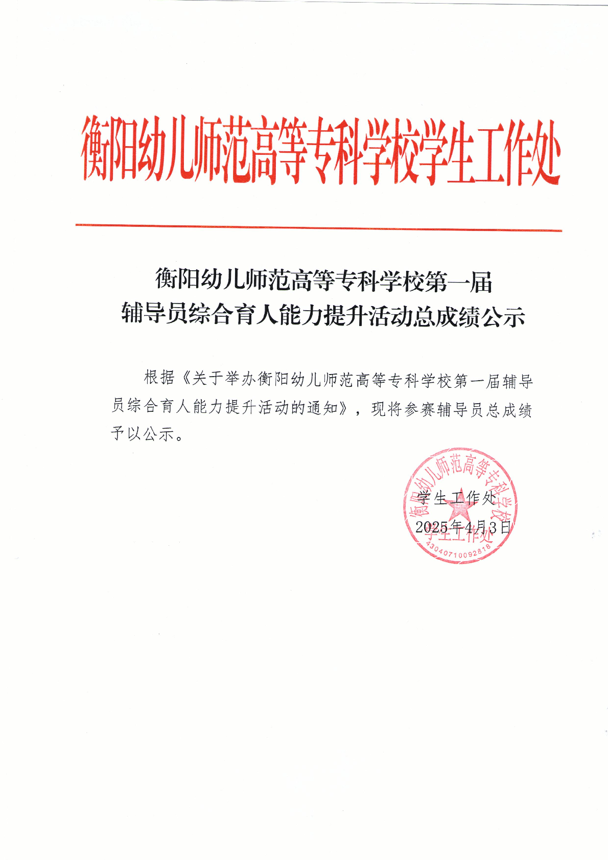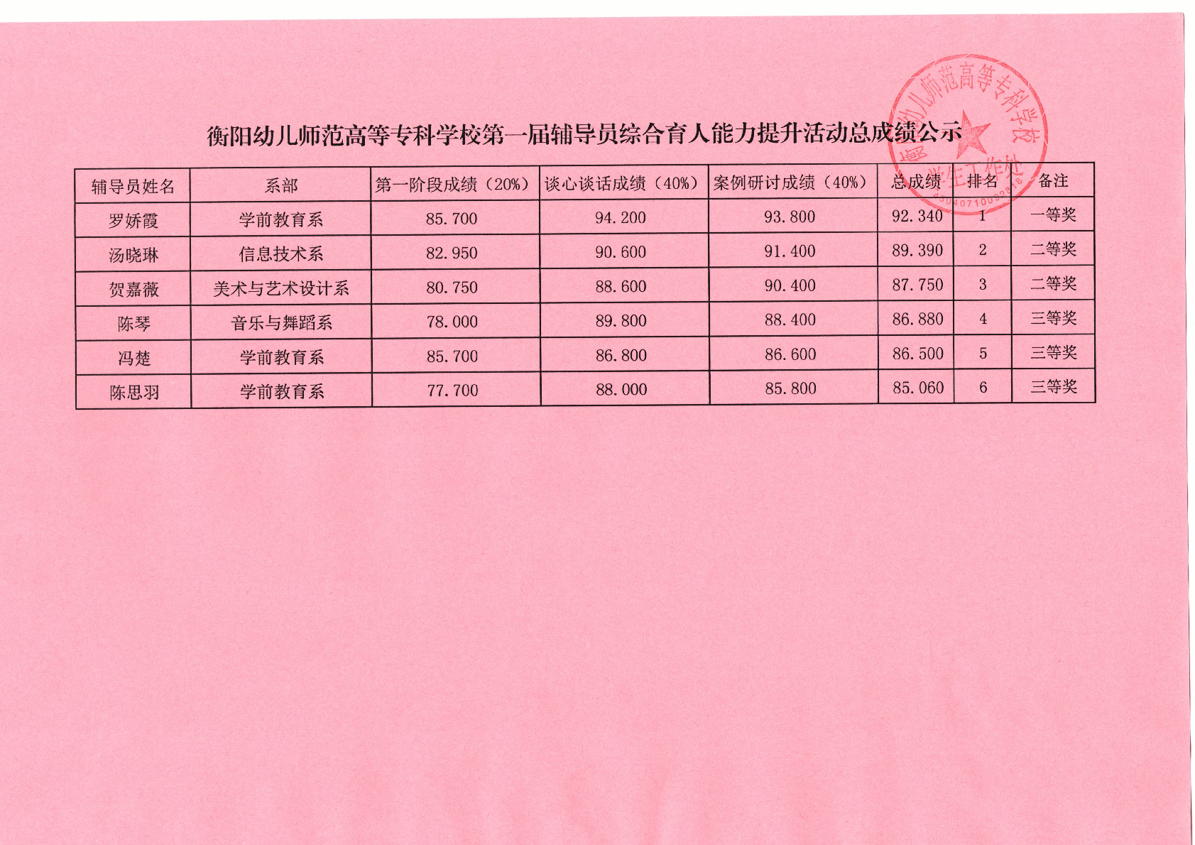 衡陽幼兒師范高等??茖W(xué)校第一屆輔導(dǎo)員綜合育人能力提升活動總成績公示