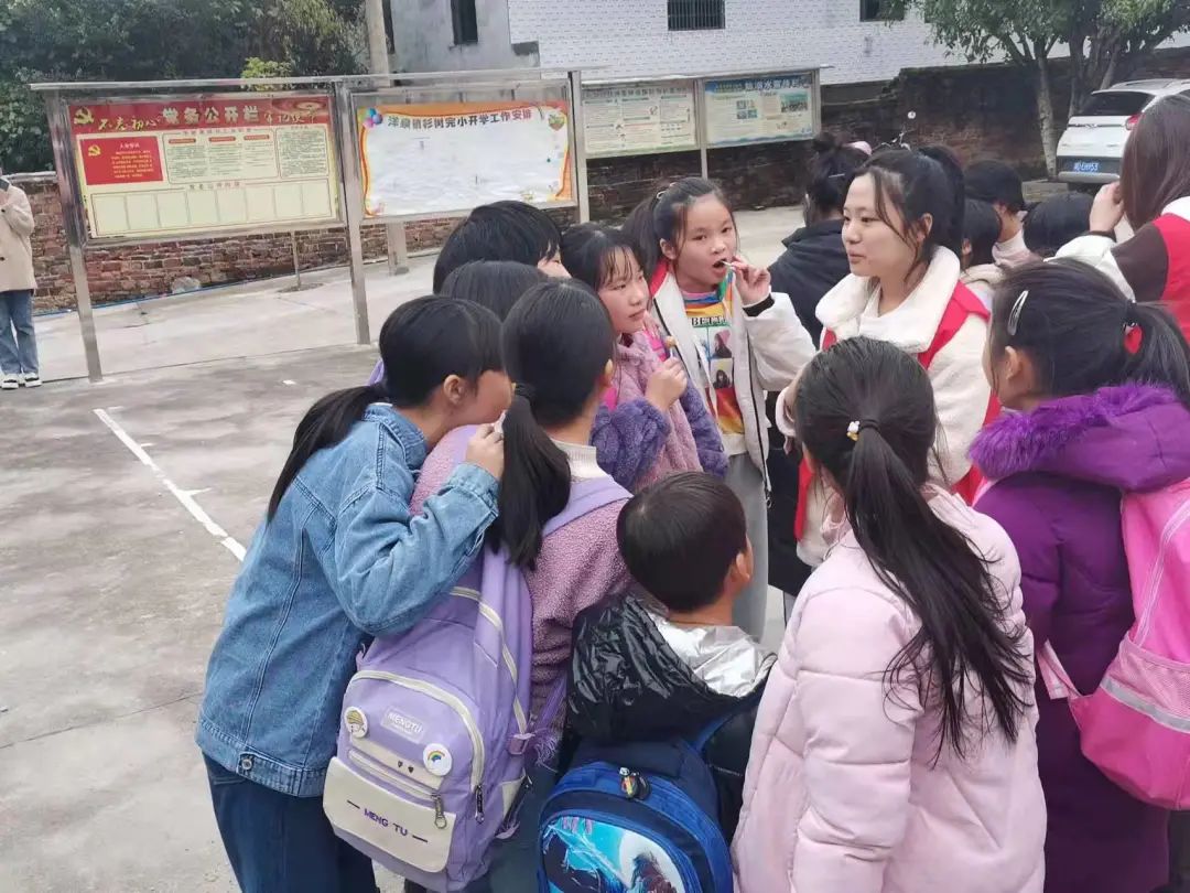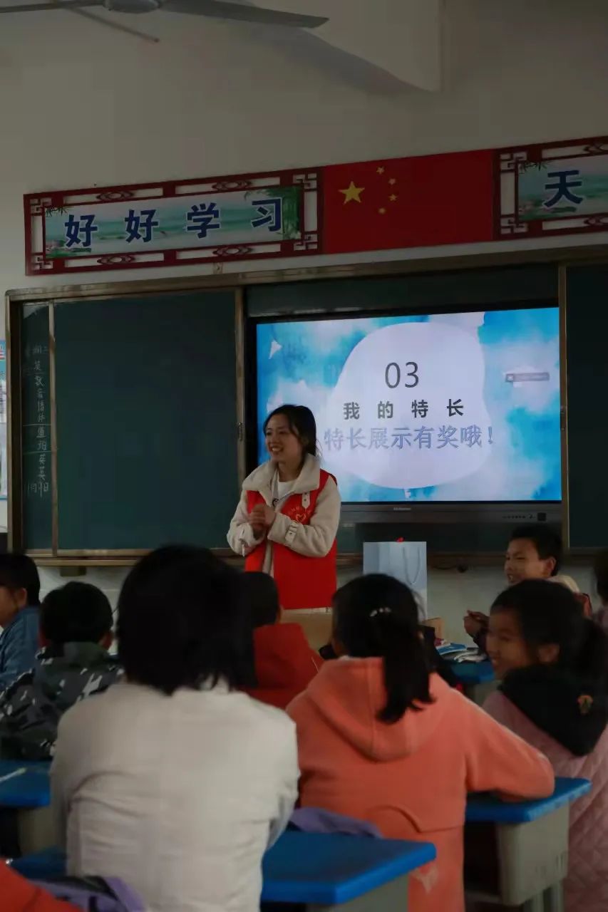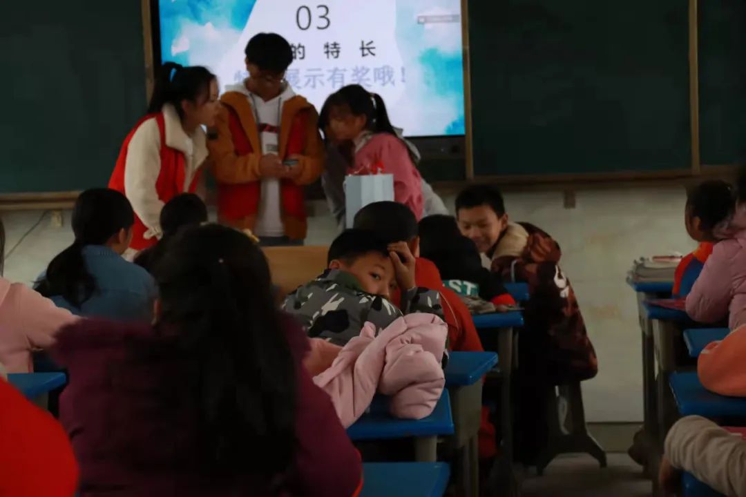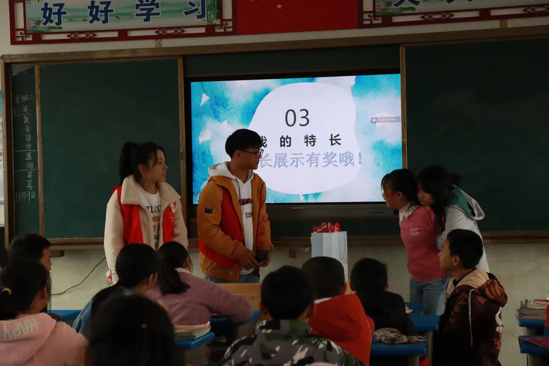 同學(xué)們積極配合志愿老師們,揮舞著他們的小手,踩著音樂的節(jié)拍,跳著屬于他們的天真無邪。 杉樹完小的老師們也跟著一起舞動(dòng),她們將來會(huì)是杉樹完小的藝術(shù)專干,希望她們今后能自己開展多彩的藝術(shù)活動(dòng)! 《花式跳繩》 由丁妍小團(tuán)隊(duì)帶領(lǐng)的花式跳繩,吸引了所有老師領(lǐng)導(dǎo)和小朋友的目光,孩子們跳著屬于他們的花樣年華,笑聲在操場上蕩漾。此時(shí)此刻,他們比驕陽還要耀眼,恣意燃燒著他們的激情,猶如大旱后的甘霖澆開了心靈之花。 《趣味武術(shù)》 張諍諍老師的小團(tuán)隊(duì)有聲有色,把小朋友帶到了一個(gè)新的世界,武功誰最強(qiáng),舍我其誰。學(xué)習(xí)武術(shù)的目的,不僅僅是為了強(qiáng)身健體,更是潛移默化的傳承。希望他們能在武術(shù)的學(xué)習(xí)中領(lǐng)會(huì)到中華優(yōu)秀傳統(tǒng)文化的魅力。 《小小主持人》 志愿老師們用小游戲拉近了彼此的距離,化解了因?yàn)楹π叨a(chǎn)生的尷尬,讓孩子們能夠在講臺上肆意展現(xiàn)自我,將自己隱藏的光芒盡情展露,被蒙塵的鉆石怎么甘心一直黯淡呢? 蔣水平老師發(fā)現(xiàn),幼高專志愿者隊(duì)造成了家長的圍觀,他們的心里產(chǎn)生了一次強(qiáng)烈的震動(dòng)!以前不愿意參加課后活動(dòng)的學(xué)生也強(qiáng)烈要求參加了?!笆欣锎髮W(xué)來鄉(xiāng)村小學(xué)啦”,相信這句話不久就會(huì)成為美談在民間流傳。 姚賽紅老師也發(fā)出感慨:“今天的支教,給鄉(xiāng)村孩子們帶去了豐富的藝術(shù)活動(dòng)體驗(yàn),更是讓我們小教、數(shù)理院同去的助教大學(xué)生們得到了迅速的成長。在帶隊(duì)老師的指導(dǎo)下,小教、數(shù)理院的學(xué)生們也得到了校方的高度贊揚(yáng)。我們不但送去了小教學(xué)院、數(shù)理學(xué)院的專業(yè)教師力量,也收獲了小學(xué)師生的情誼”。 周晶晶同學(xué)表示:“昨天經(jīng)歷一個(gè)很特別的下午,很榮幸來到杉樹完小帶領(lǐng)同學(xué)們上了一堂很有趣的播音課?。剛開始特別緊張,怕自己不能把所學(xué)的播音知識很好的教給她們,可當(dāng)我看到一張張可愛的面孔,她們瞪大圓圓的眼睛可愛的看著我,我頓時(shí)變得輕松了,小朋友們?nèi)毯芘浜衔遥屛矣X得原來我可以做好小老師。傍晚要準(zhǔn)備回校時(shí),她們拉著我的手,強(qiáng)烈要求我去她們家住,我心中便油然而生不舍之情,非常期待與她們的再次相見”。 課后交流 課后服務(wù)后,我們隨機(jī)找了兩位可愛的小同學(xué)進(jìn)行采訪,讓我們來看看她們對這次活動(dòng)的看法吧! 我們還采訪了完小的校長,聽聽他怎么看待我們這次的活動(dòng)呢? 揮手告別 在最后將要離開的時(shí)候,孩子們圍在大巴周圍依依不舍的揮著手,一聲聲說著再見,離別的惆悵籠罩在大巴里。但是我們都知道,世上沒有不散的宴席,大家只能在心里殷殷期待著下次的再見。 這次活動(dòng)讓我們看到了同學(xué)們對新鮮事物的熱情,這份熱情就像冬日里的暖陽,源源不斷的散發(fā)著他們的光和熱,也讓靠近的人被這份溫暖深深打動(dòng)著。同時(shí),對于活動(dòng)中那些即將成為人民教師的志愿者們也是一次深刻地感悟吧,或許成長就在這一刻悄然發(fā)芽了呢。