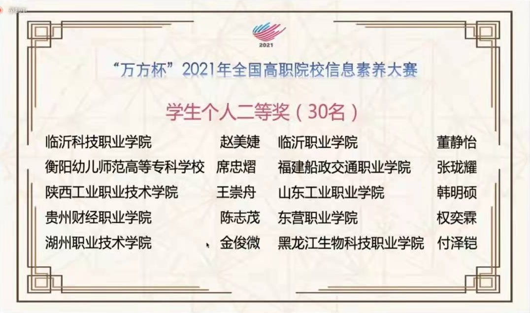小教2001班席忠熠同學(xué)在全國(guó)高職院校信息素養(yǎng)大賽中成績(jī)排名為全國(guó)師范類(lèi)高專(zhuān)學(xué)校最好成績(jī),獲國(guó)二等獎(jiǎng),小教2006班鄧鈺虹、小教2007班肖彤、小教2004班戴璐同學(xué)獲省三等獎(jiǎng)。