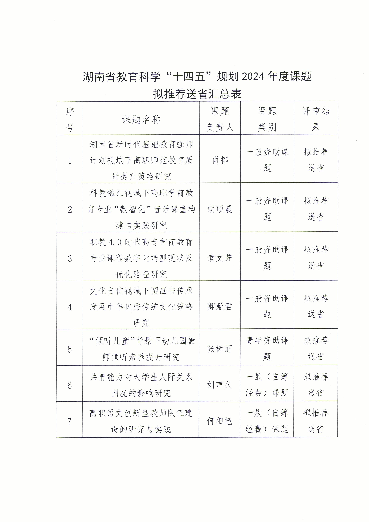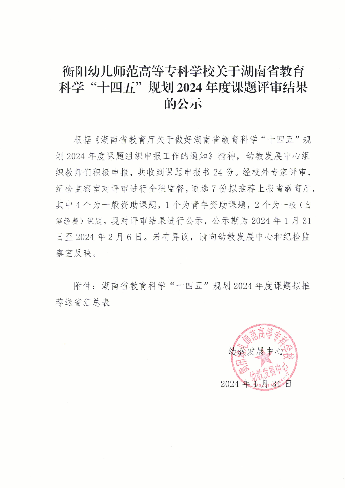 衡陽(yáng)幼兒師范高等??茖W(xué)校關(guān)于湖南省教育科學(xué)“十四五”規(guī)劃2024年度課題評(píng)審果的公示