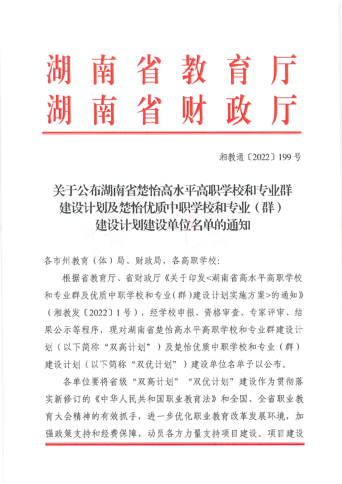 湘教通[2022]199號(hào) ?關(guān)于公布湖南省楚怡高水平高職學(xué)校和專業(yè)群建設(shè)計(jì)劃及楚怡優(yōu)質(zhì)中職學(xué)校和專業(yè)(群)建設(shè)計(jì)劃建設(shè)單位名單的通知.pdf