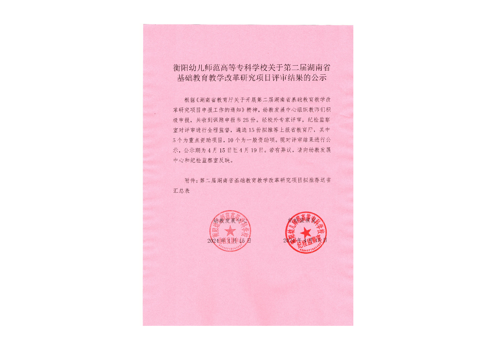 衡陽幼兒師范高等??茖W(xué)校關(guān)于第二屆湖南省基礎(chǔ)教育教學(xué)改革研究項目評審結(jié)果的公示.pdf