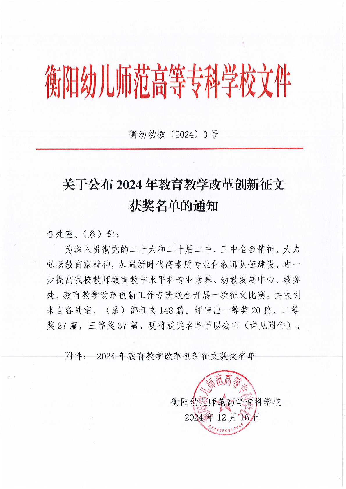 衡幼幼教〔2024〕3號 關(guān)于公布2024年教育教學改革創(chuàng)新征文獲獎名單的通知
