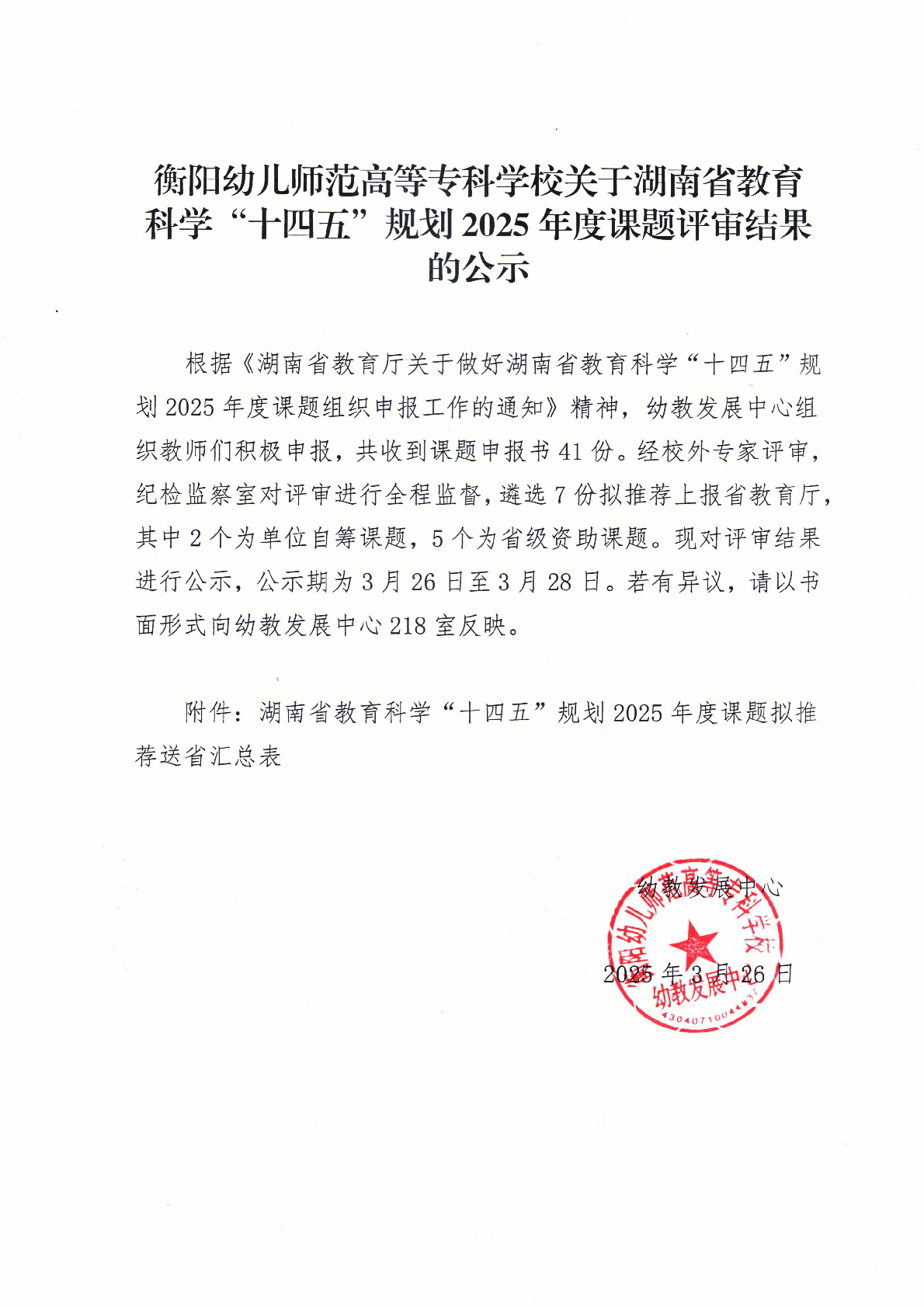 衡陽(yáng)幼兒師范高等??茖W(xué)校關(guān)于湖南省教育科學(xué)“十四五”規(guī)劃2024年度課題評(píng)審結(jié)果的公示
