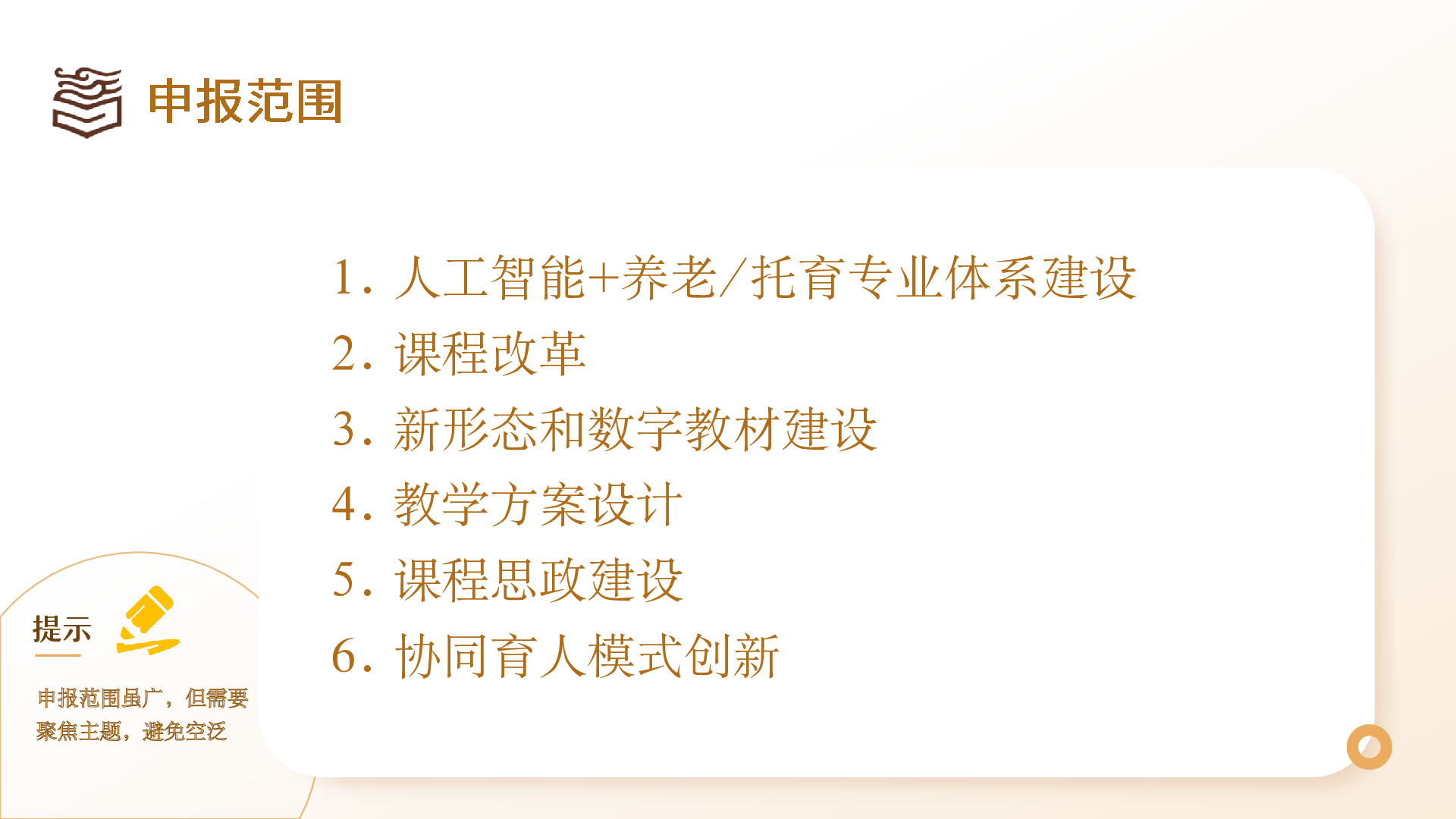 (二)課題研究以《高等職業(yè)教育??茖I(yè)教學(xué)標(biāo)準(zhǔn)(2025年)》(以下簡稱“新專標(biāo)”)為依據(jù),聚焦養(yǎng)老、托育相關(guān)專業(yè)人才培養(yǎng)和課程教材建設(shè)中的重點、難點問題。重點關(guān)注:人工智能+養(yǎng)老/托育專業(yè)體系建設(shè)、課程改革、新形態(tài)和數(shù)字教材建設(shè)、教學(xué)方案設(shè)計,以及課程思政建設(shè)、協(xié)同育人模式創(chuàng)新等方面。