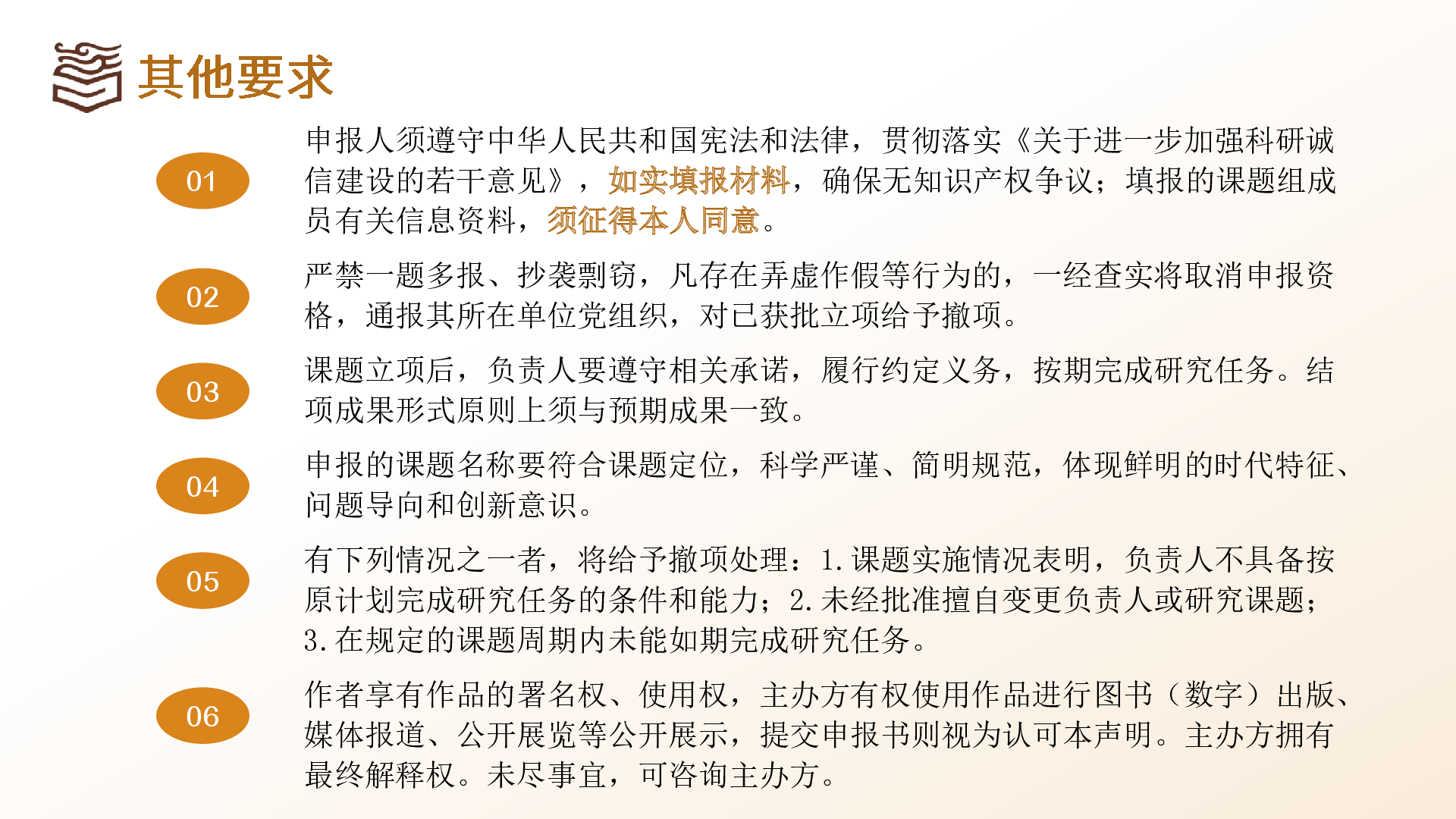 (一)申報人須遵守中華人民共和國憲法和法律,貫徹落實《關(guān)于進一步加強科研誠信建設(shè)的若干意見》,如實填報材料,確保無知識產(chǎn)權(quán)爭議;填報的課題組成員有關(guān)信息資料,須征得本人同意。